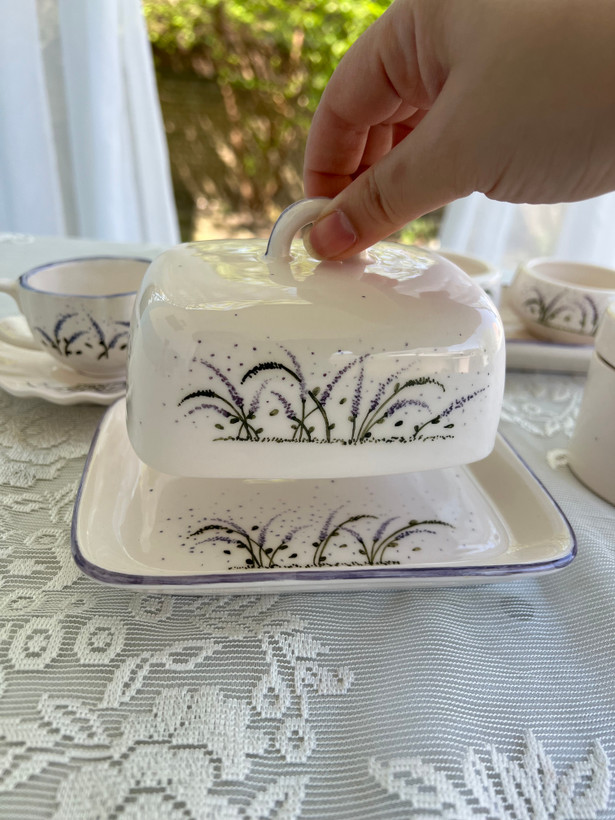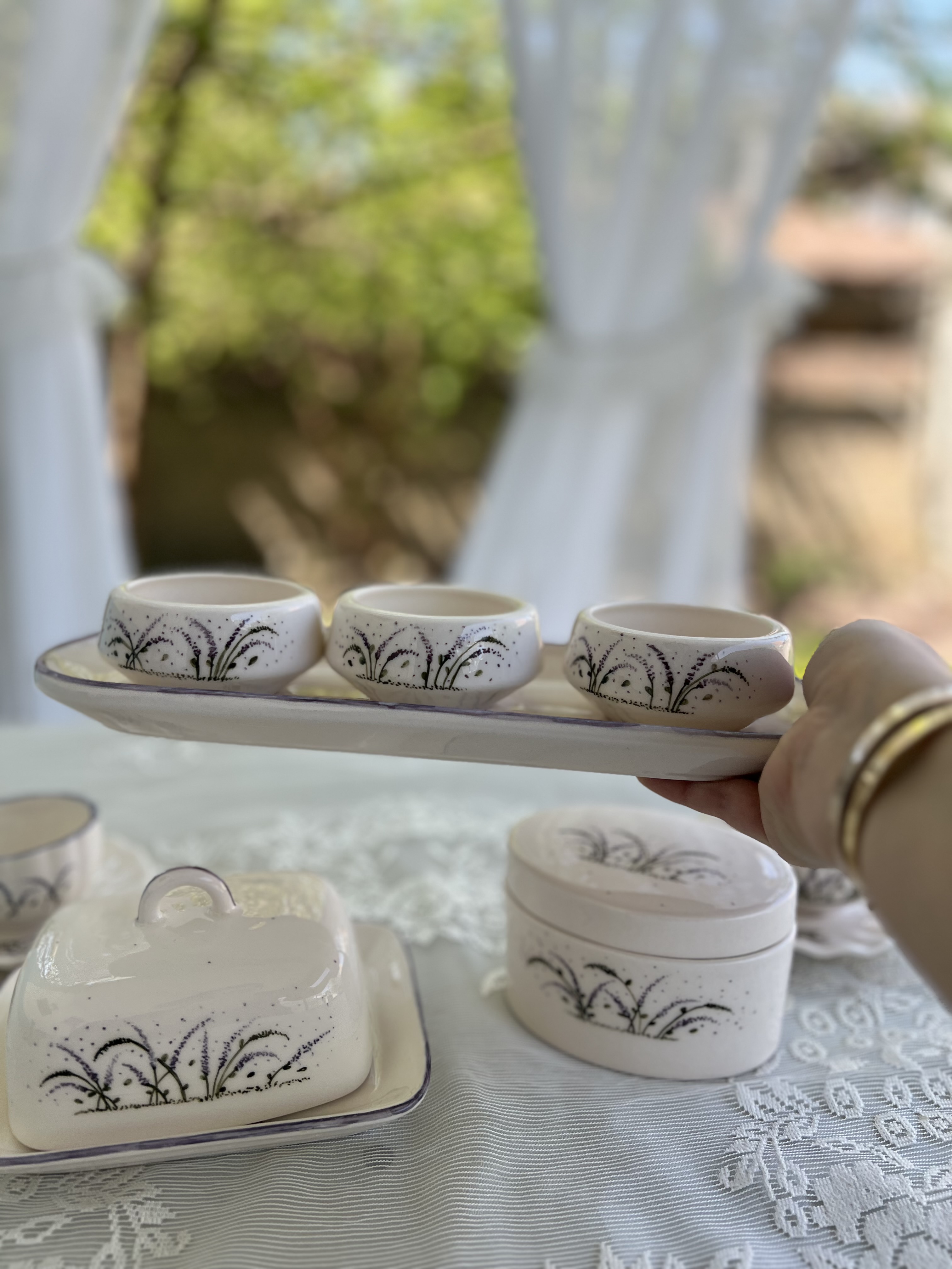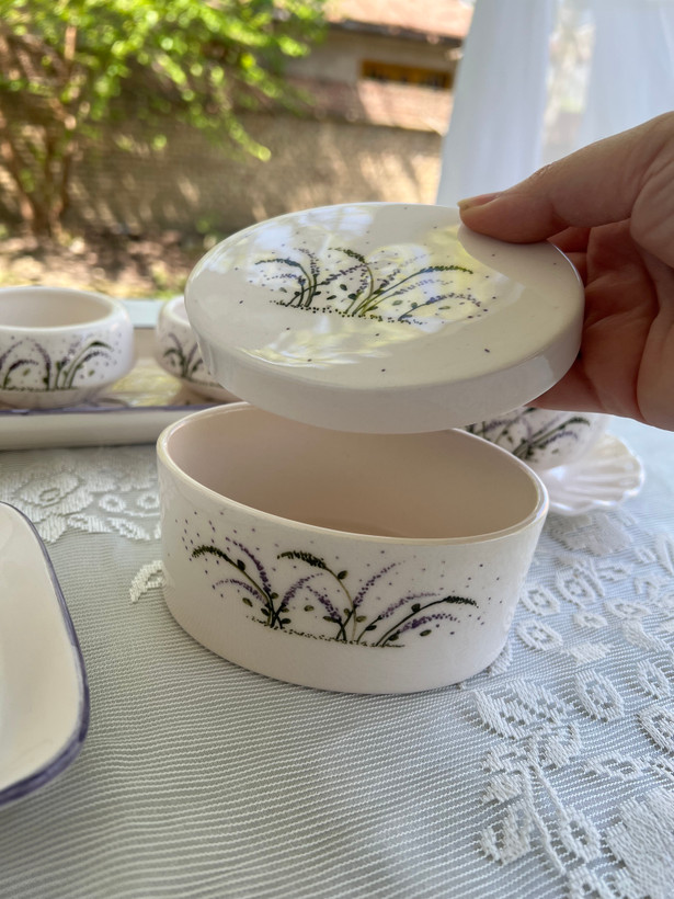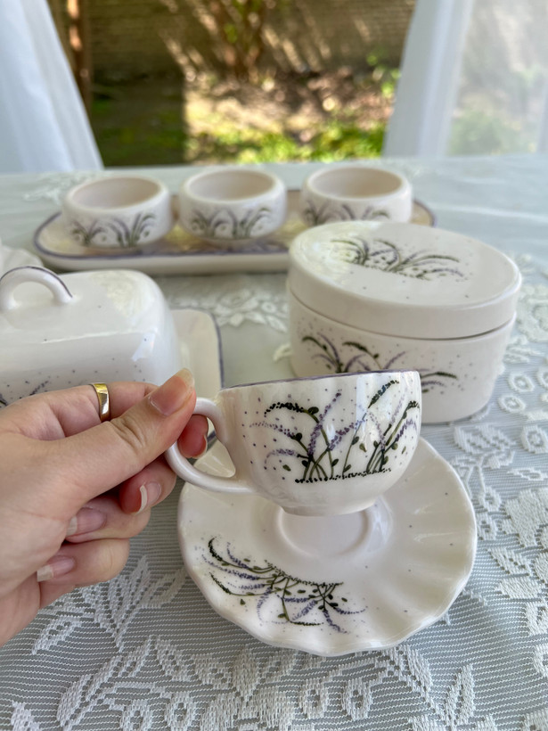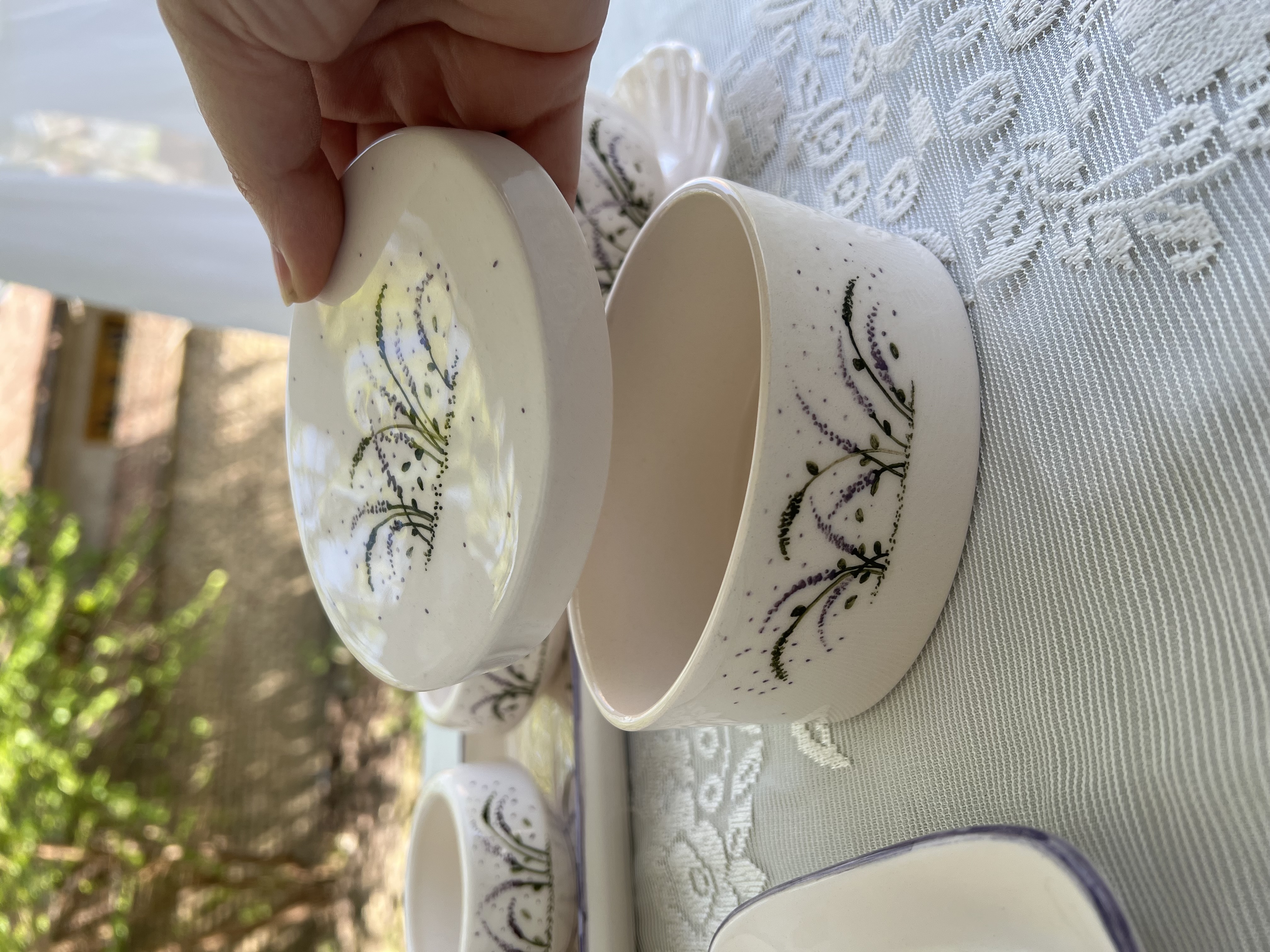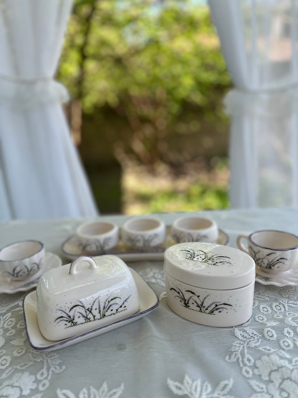 این سرویس شامل سه عدد فنجان و سه عدد کاسه مربا و یک عدد دیس و ویک عدد قندان و یک عدد کره خوری و یک عدد قوری
